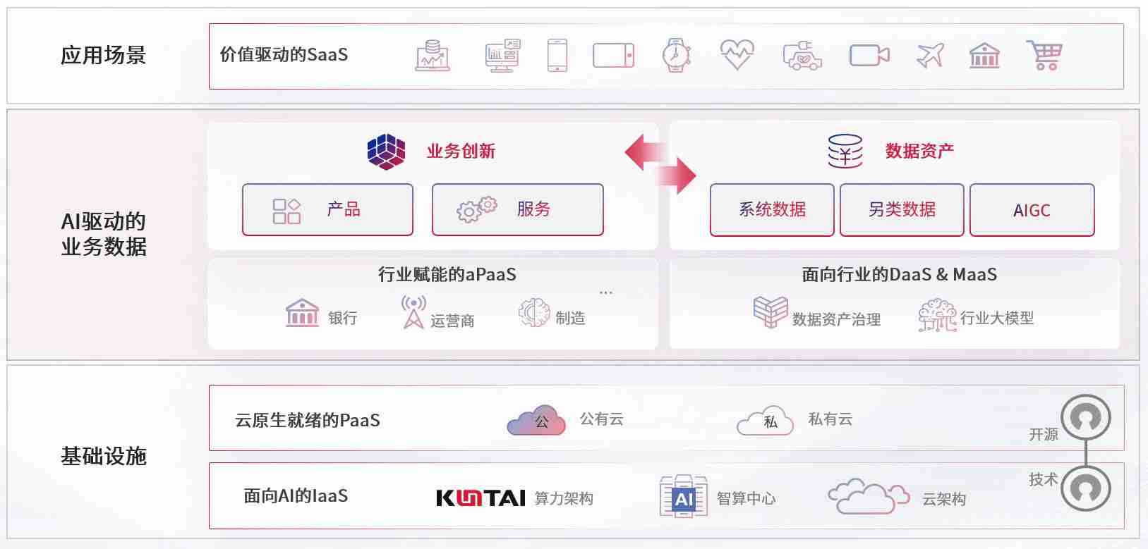 数字时代,,围绕企业数字化转型的关键要素,,,z6尊龙数码开创性的提出数云融合战略和技术体系框架,,,,着力在云原生、、数字原生、、AI原生和信创产业上架构产品和服务能力,,,为处在不同数字化转型阶段的快消零售、、、、汽车、、金融、、医疗、、、政企、、教育、、、运营商等行业客户提供泛在的敏捷IT能力和融合的数据驱动能力,,构建跨界融合创新的数字业务场景和新业务模式,,,助力企业级客户建立面向未来的核心能力和竞争优势,,全面推动社会的数字化、、、智能化转型升级。。。
