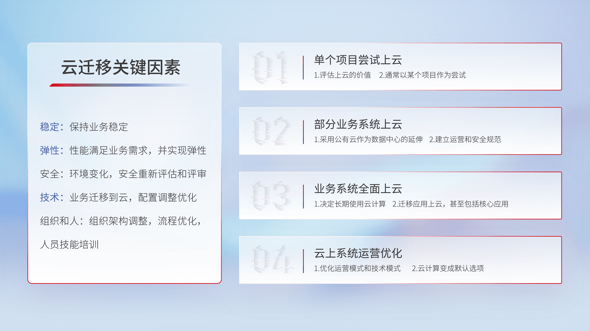 结合实际业务,,,从规划设计、、云平台选型、、、云原生改造、、数据迁移、、集成交付,,,,迁移全过程为客户识别最佳上云路径,,做好风险识别管理,,设计网络架构、、、身份权限、、、、安全审计合规、、、、操作审计、、、日志审计、、、监控告警策略、、、、多站点容灾设计等,,对云上基础设施进行整体规划,,,,提升IT治理水平,,以满足弹性、、高可用、、高性能的需求。。。。